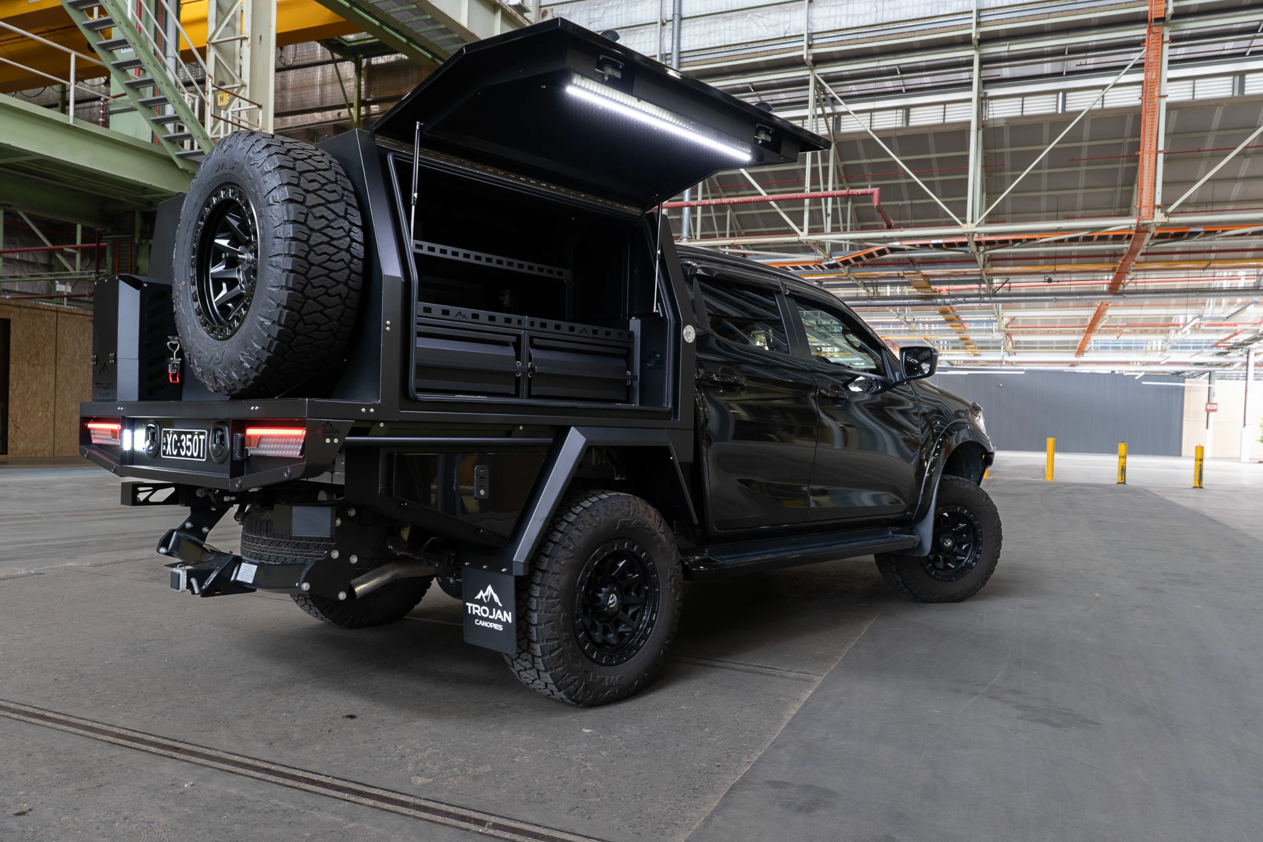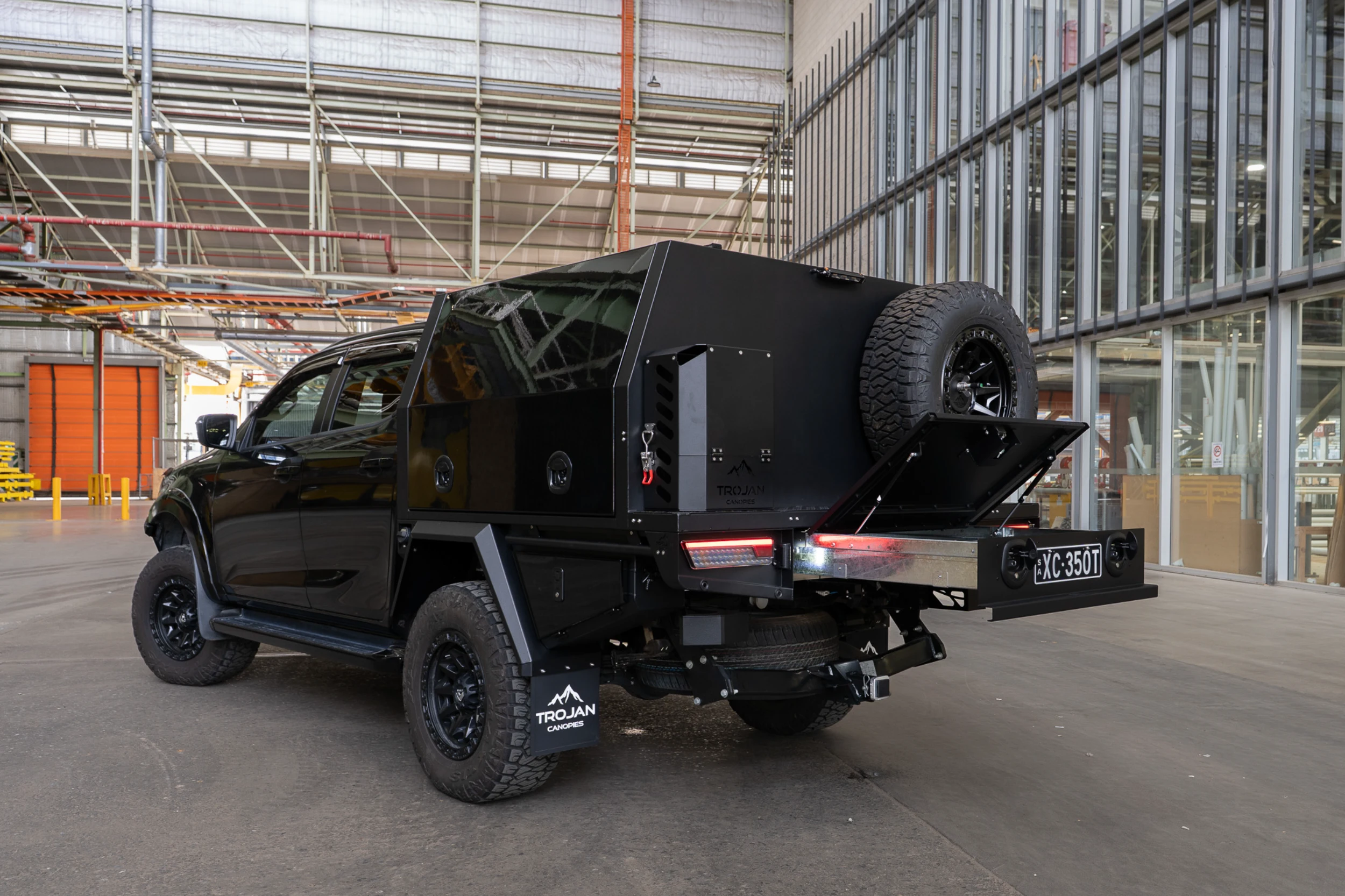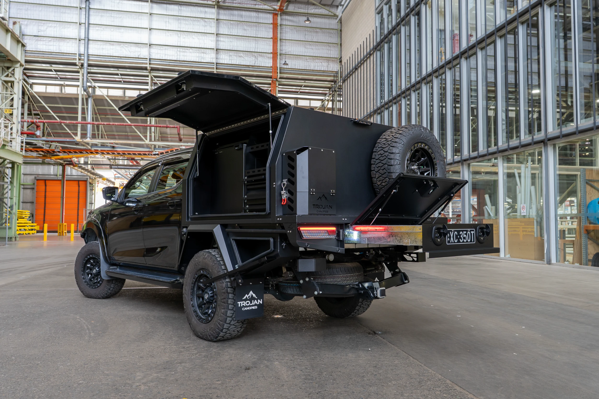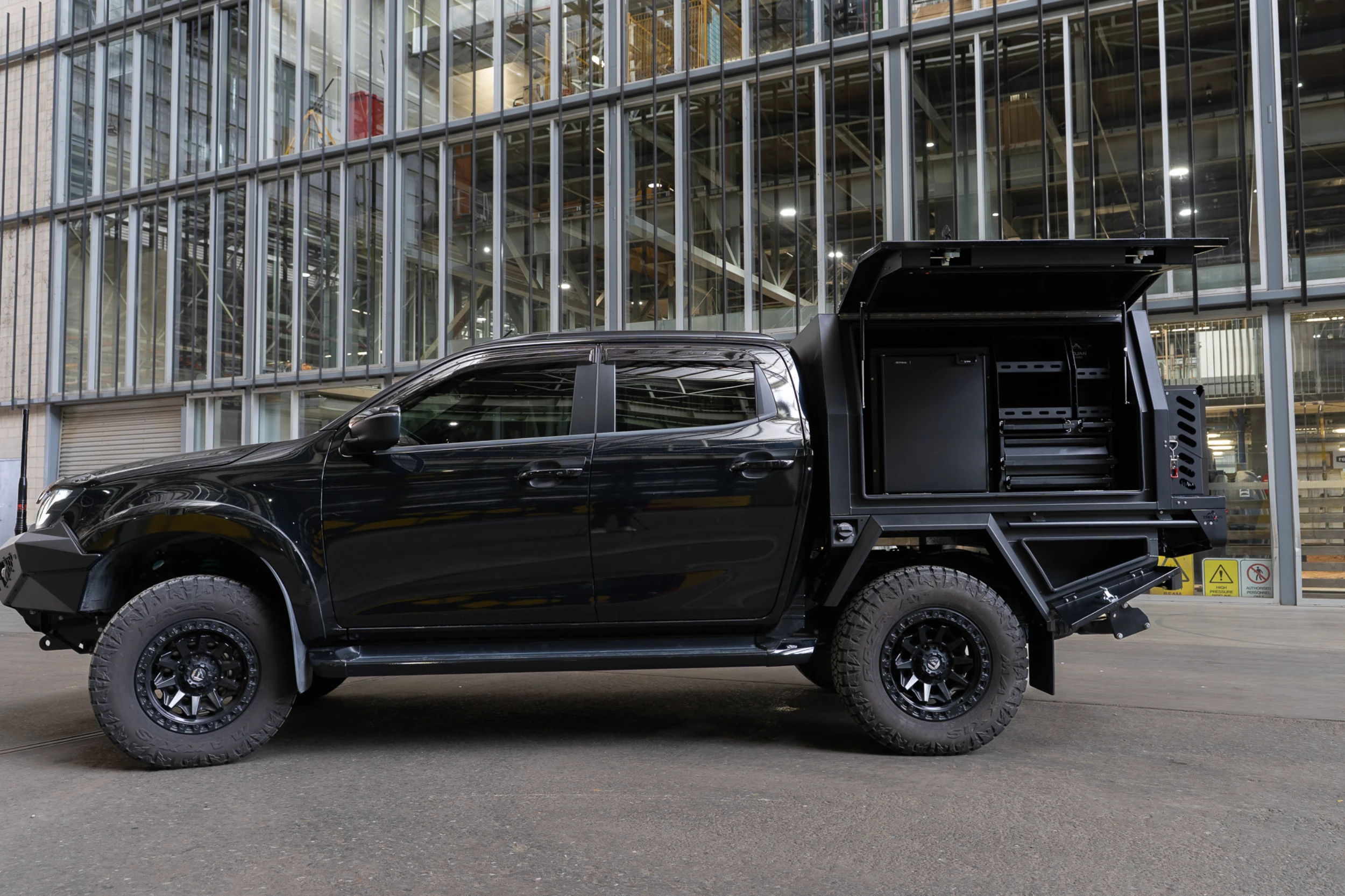 The entire setup is finished in matte black powder coat to match the D-MAX’s aggressive styling. The canopy and undertray toolbox doors have been colour coded to the DMAX. With precision TIG welds, gas-strut lift doors, and integrated LED lighting, this chassis mount canopy delivers form, function, and refinement in equal measure.