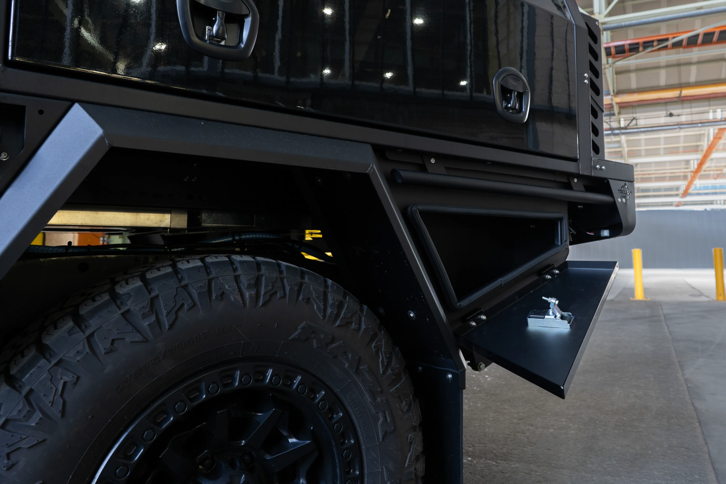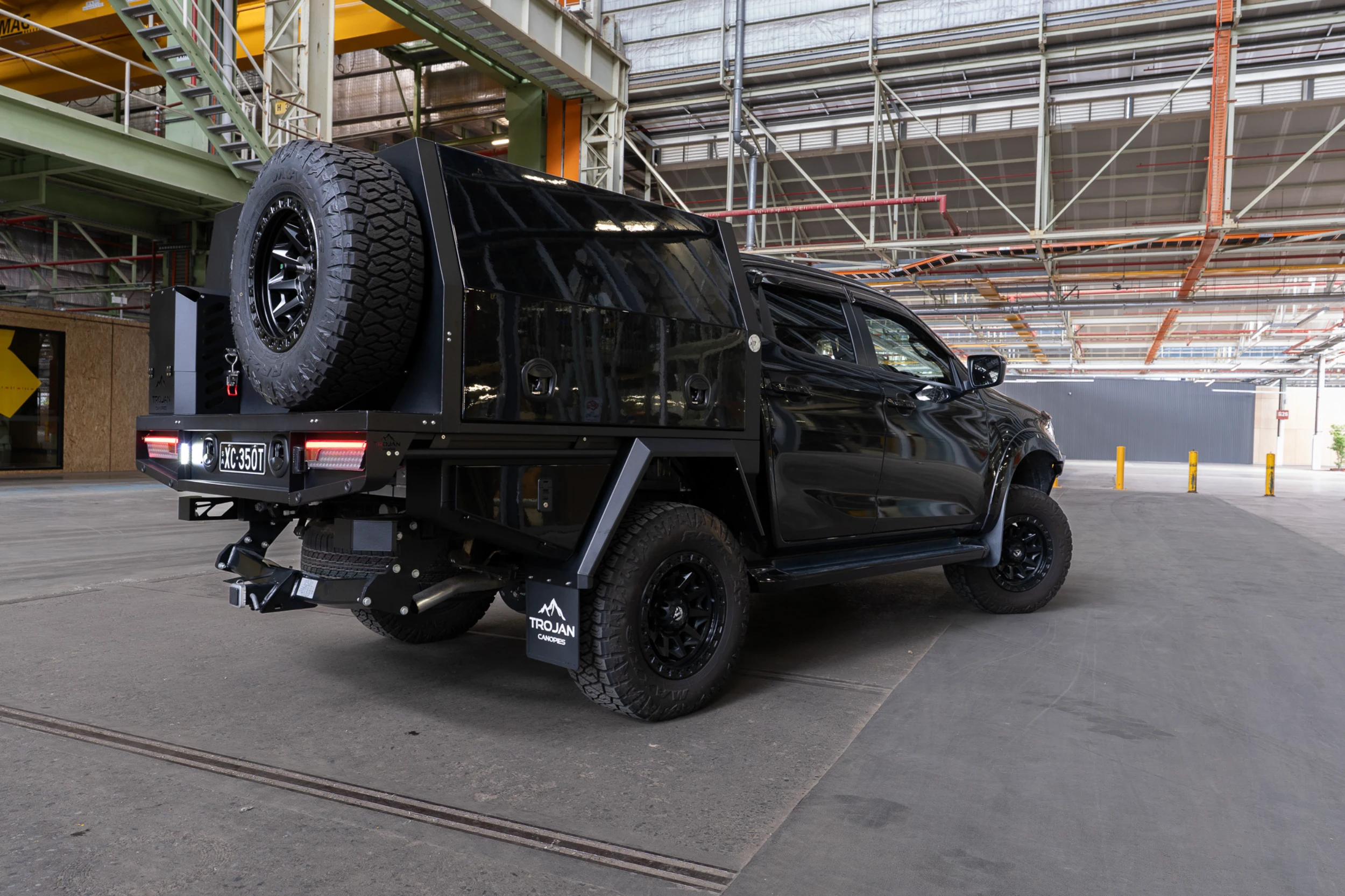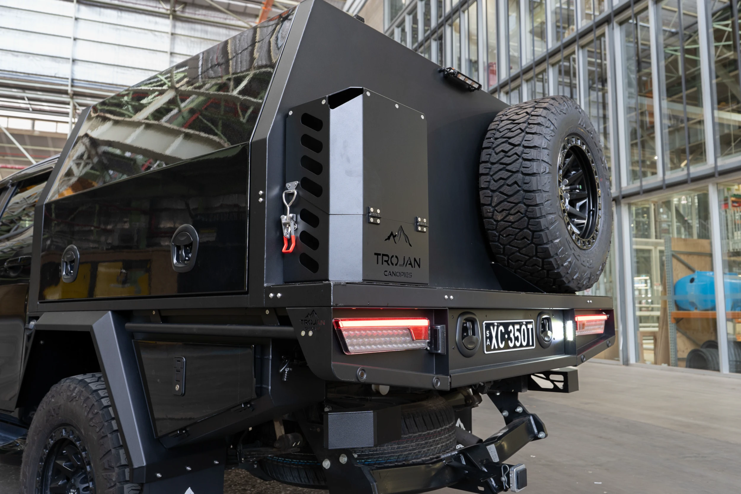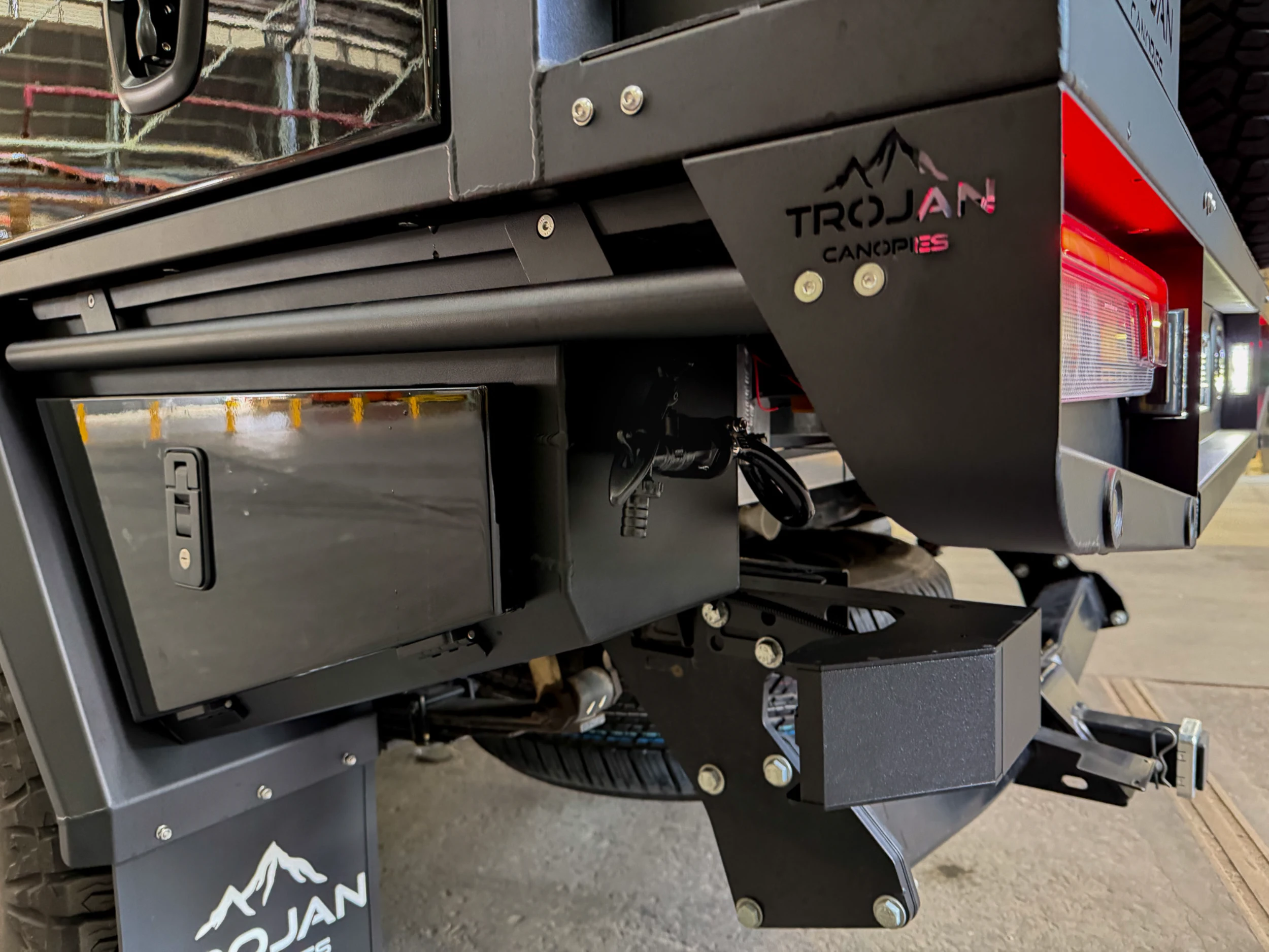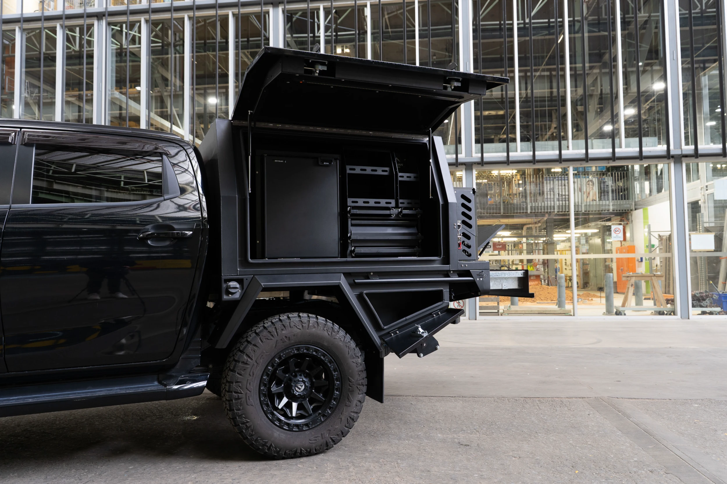 The entire setup is finished in matte black powder coat to match the D-MAX’s aggressive styling. The canopy and undertray toolbox doors have been colour coded to the DMAX. With precision TIG welds, gas-strut lift doors, and integrated LED lighting, this chassis mount canopy delivers form, function, and refinement in equal measure.