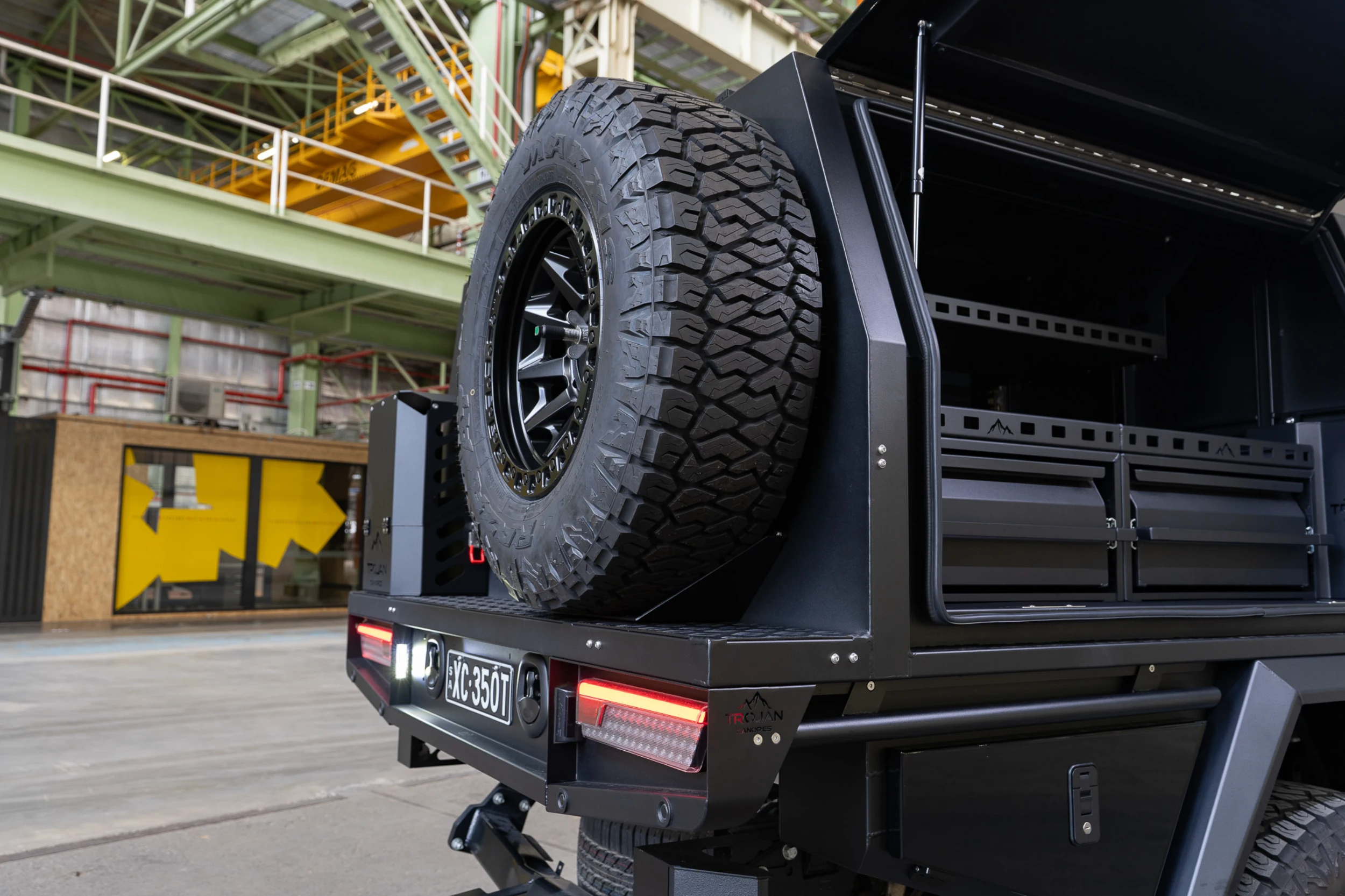 At the rear, the build features a jerry can holder and spare wheel carrier integrated seamlessly into the rear bar. The design maintains a clean, modular finish while keeping essential gear secure and accessible.