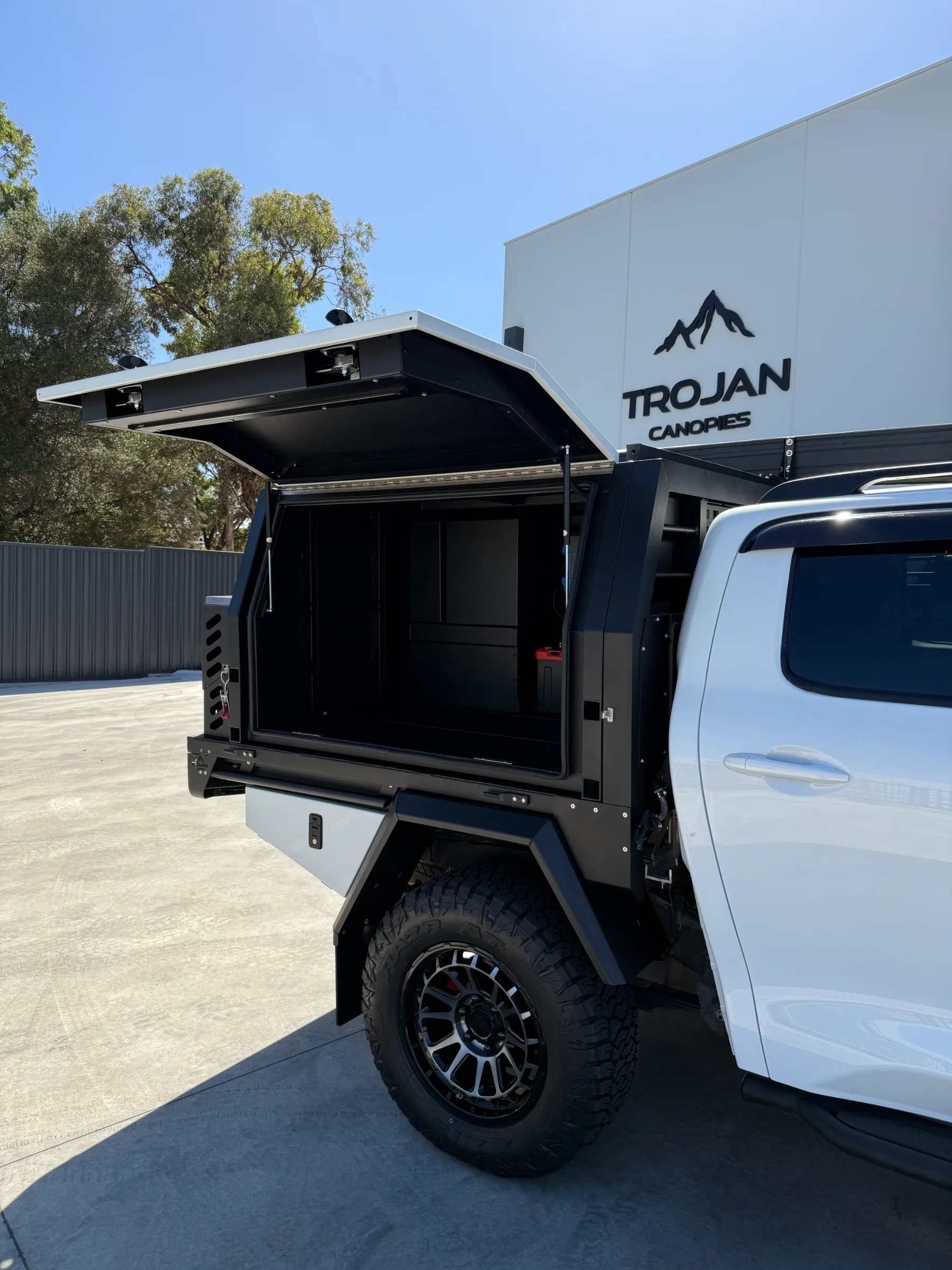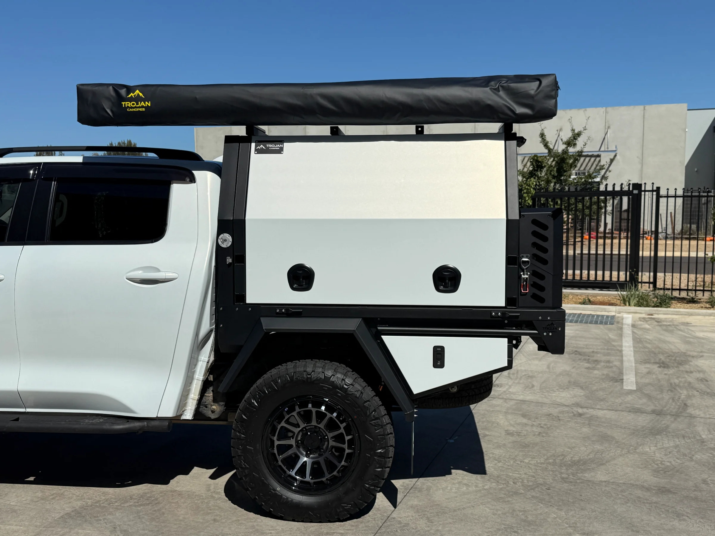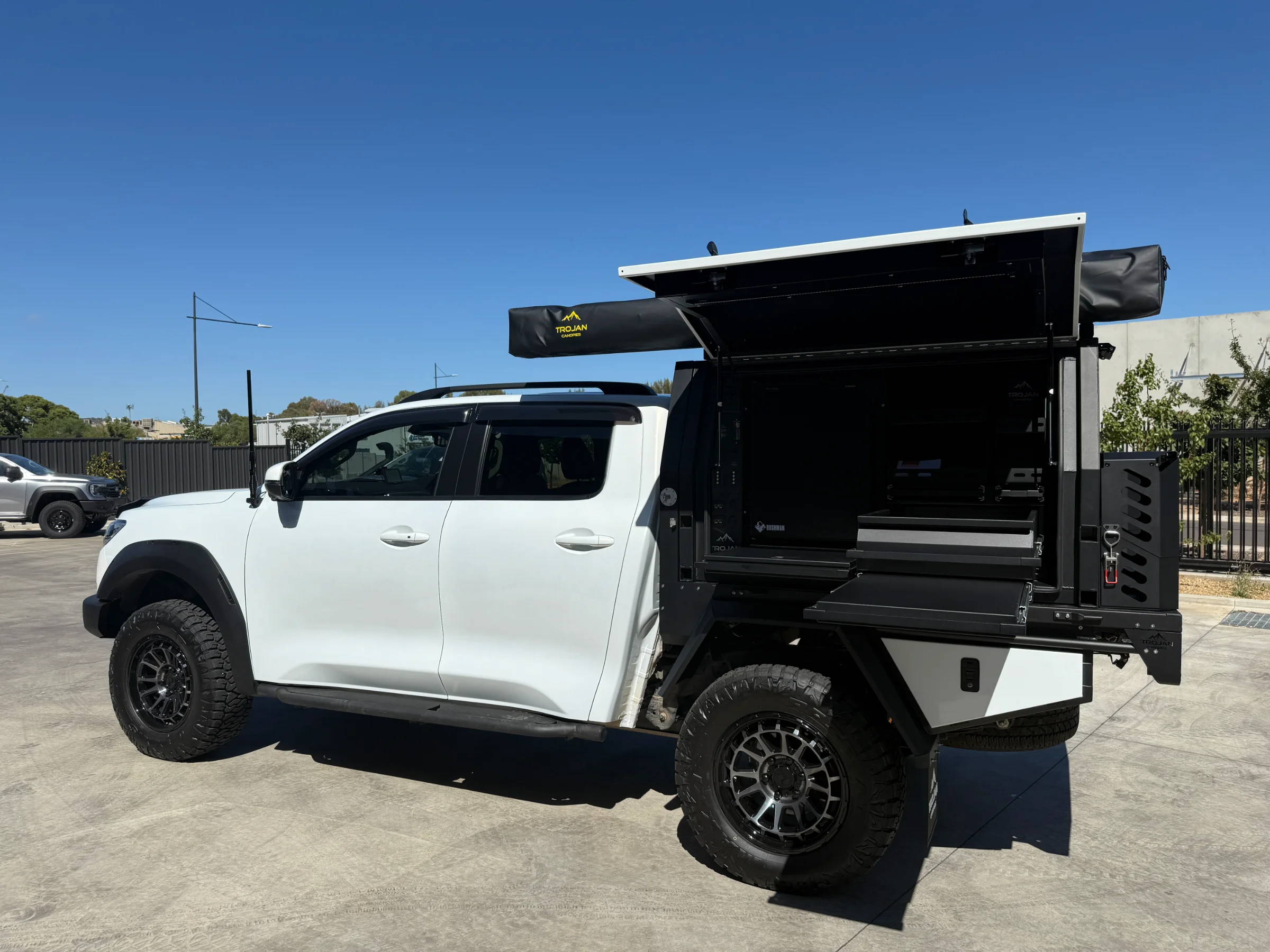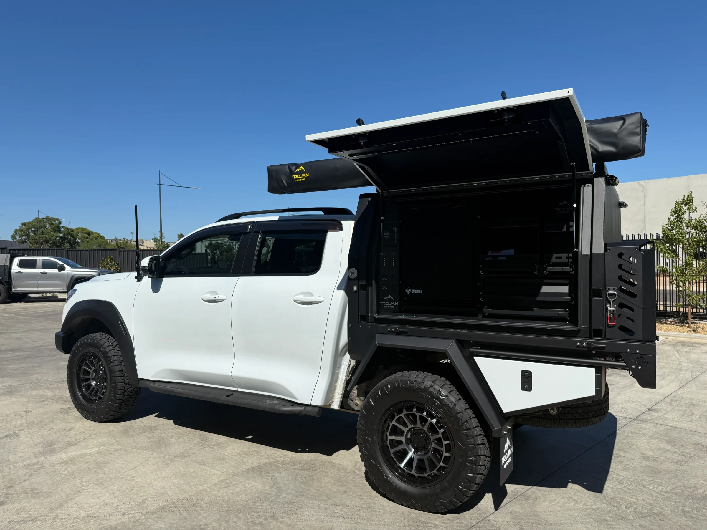 Topped off with a Trojan branded 270° awning mounted to the canopy roof rack load bars. It rolls out in seconds and pack away just as fast. Includes integrated LED lights.