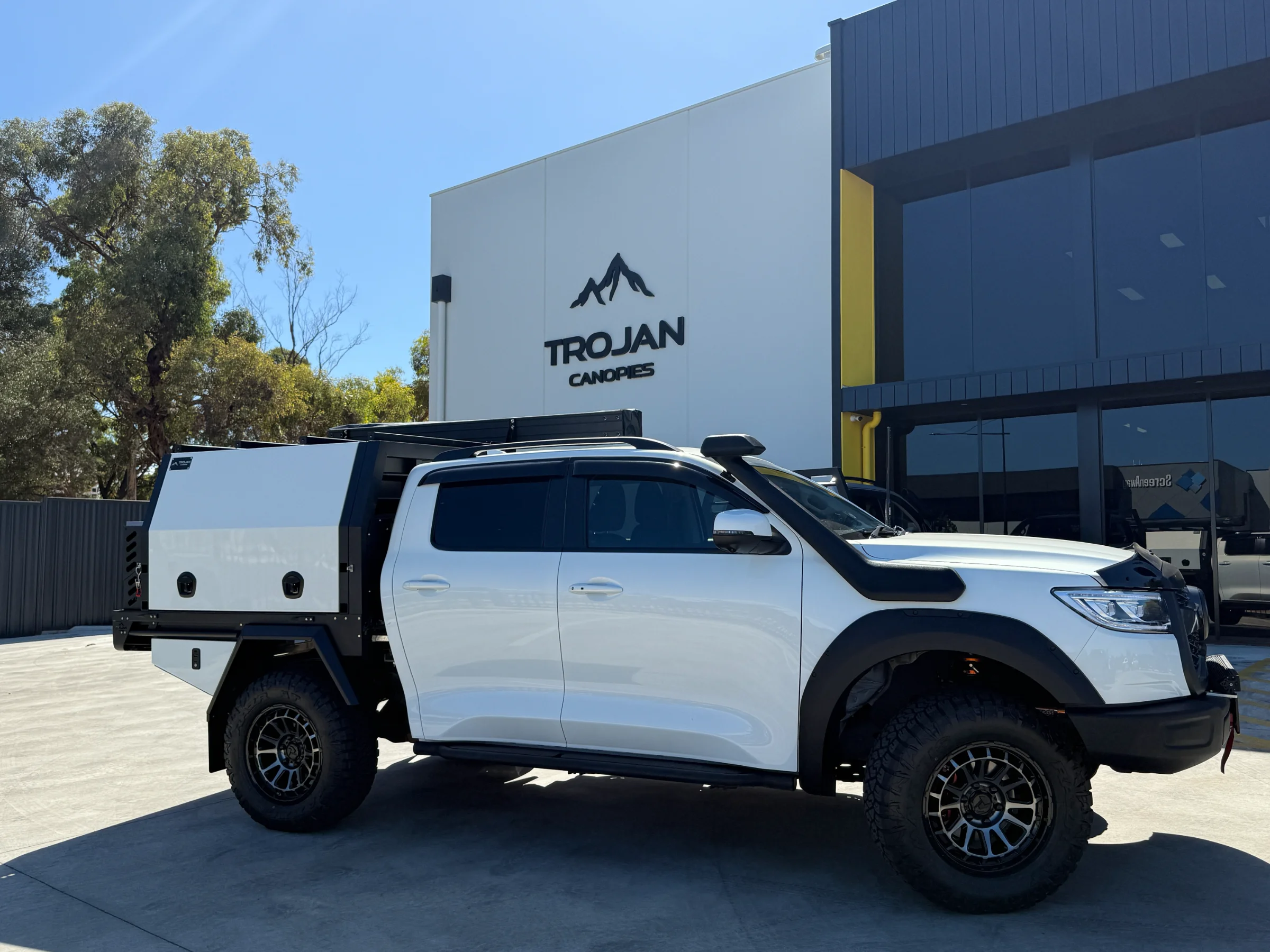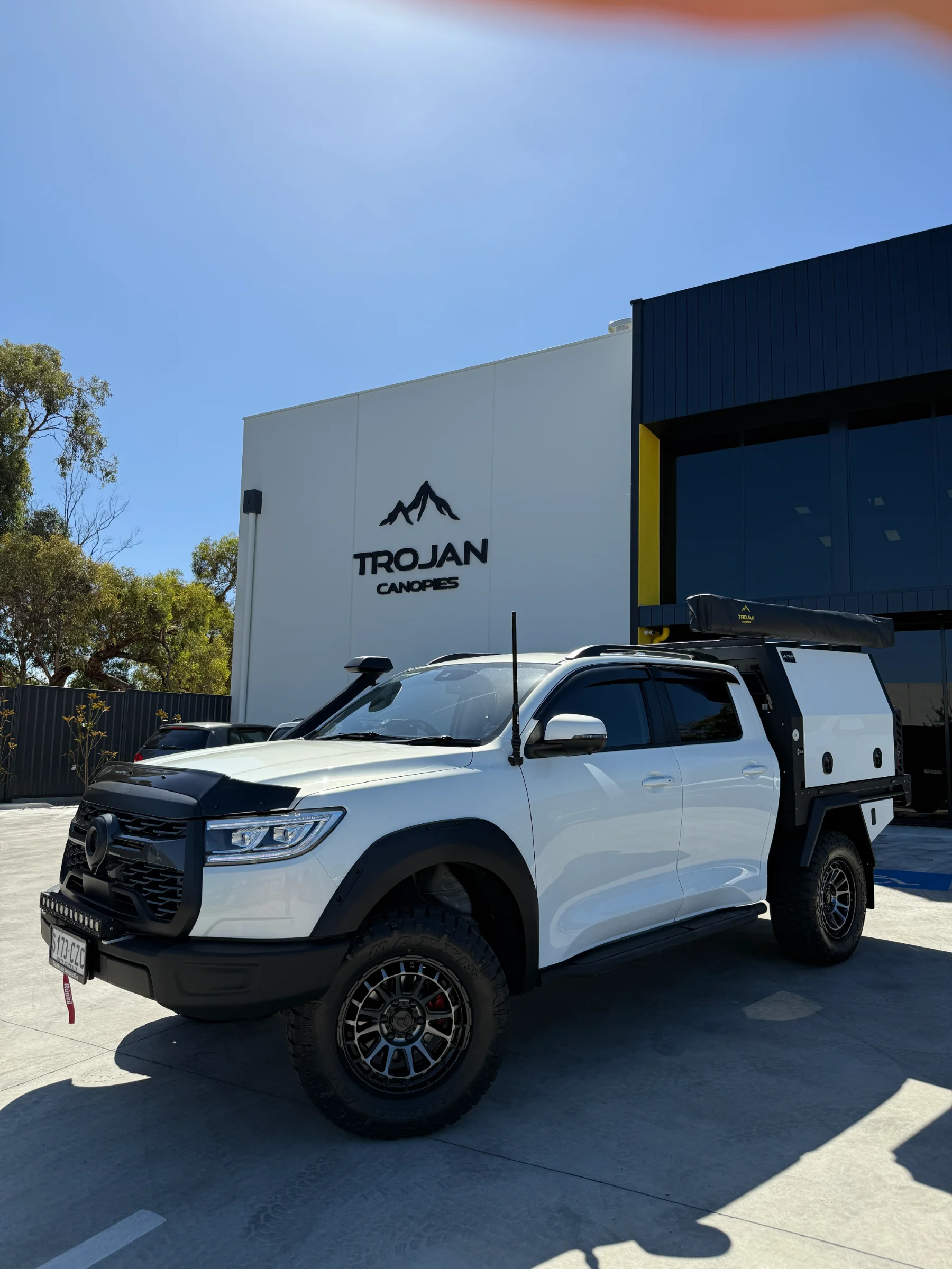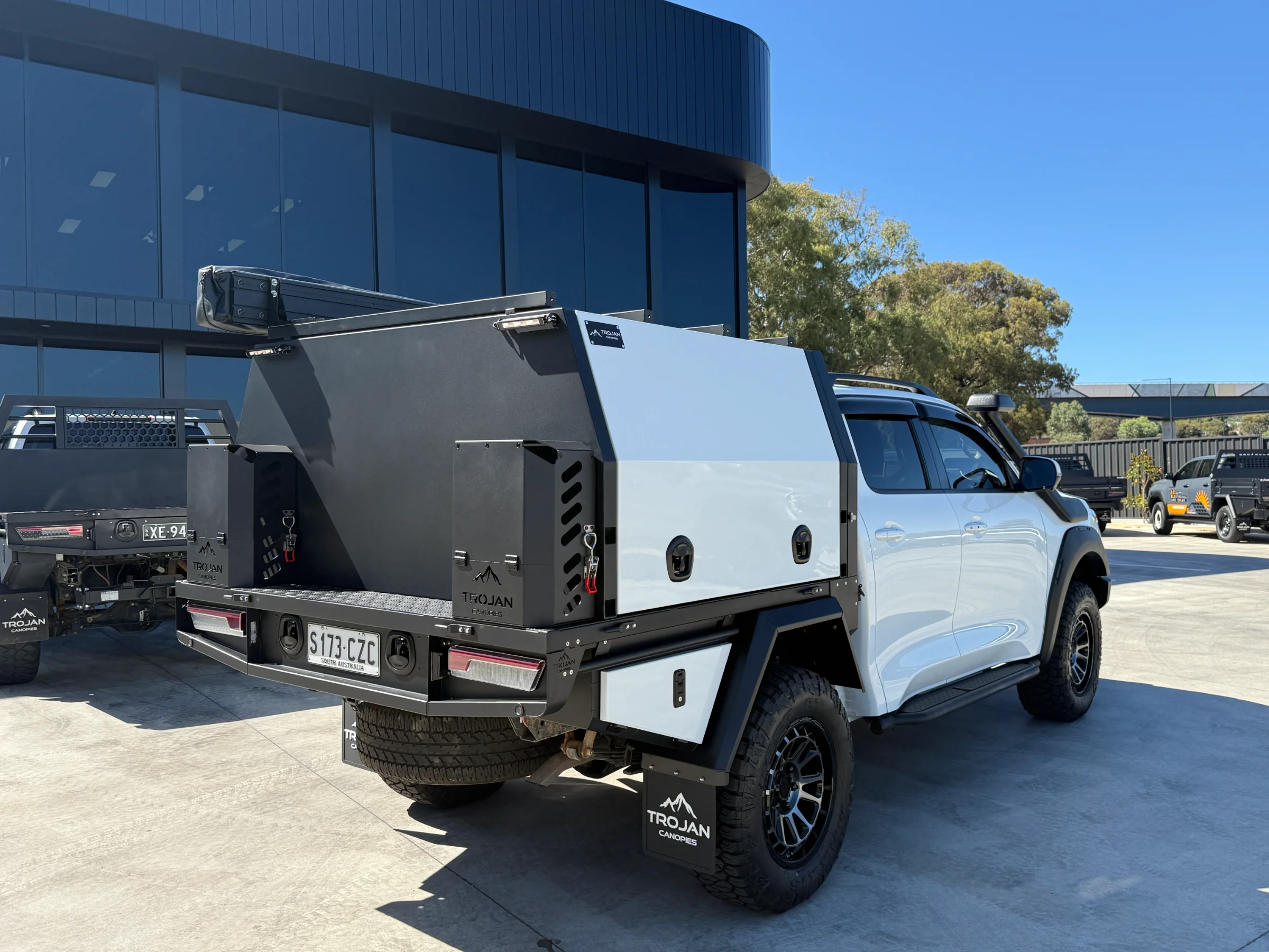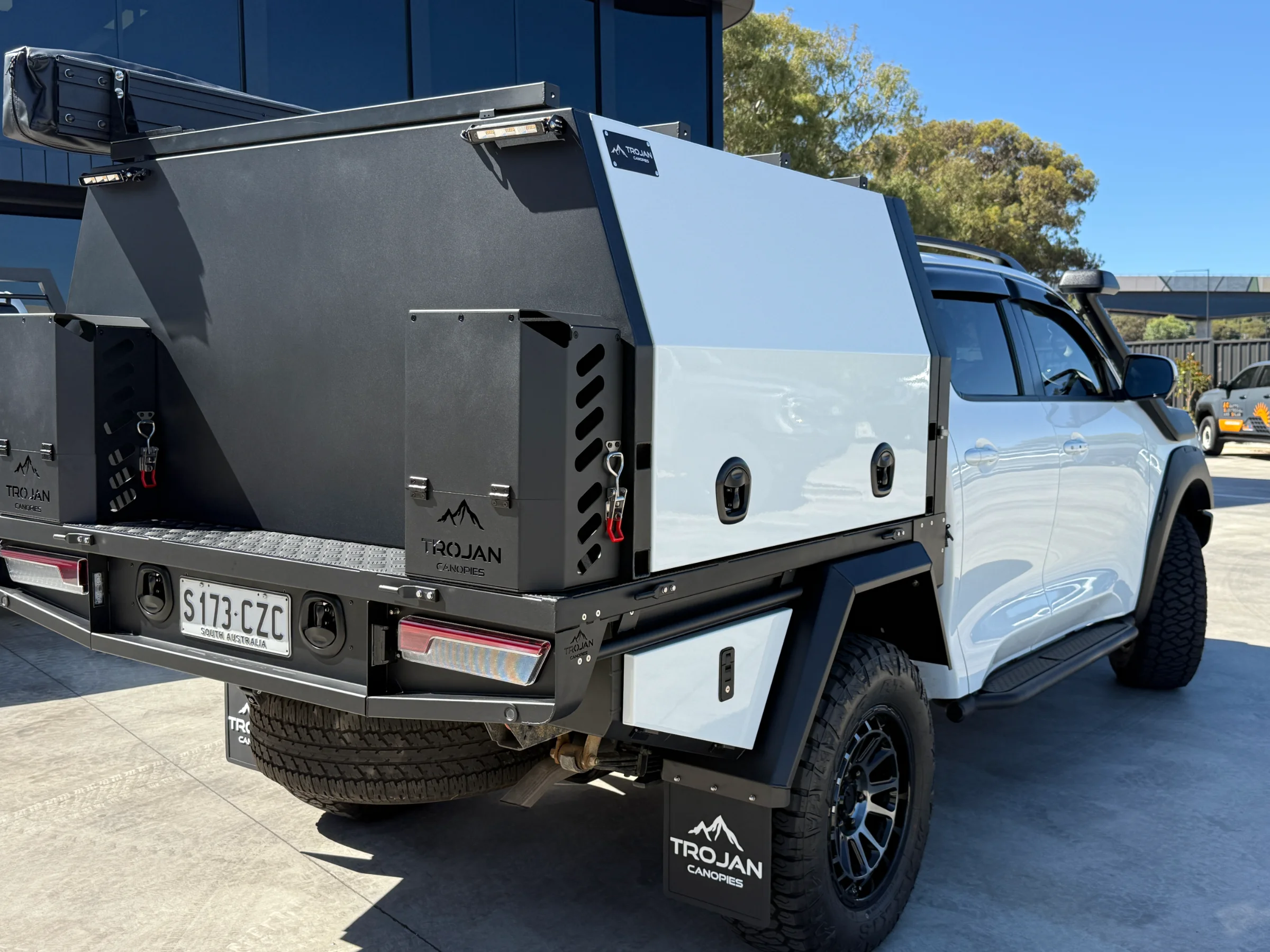 Topped off with a Trojan branded 270° awning mounted to the canopy roof rack load bars. It rolls out in seconds and pack away just as fast. Includes integrated LED lights.