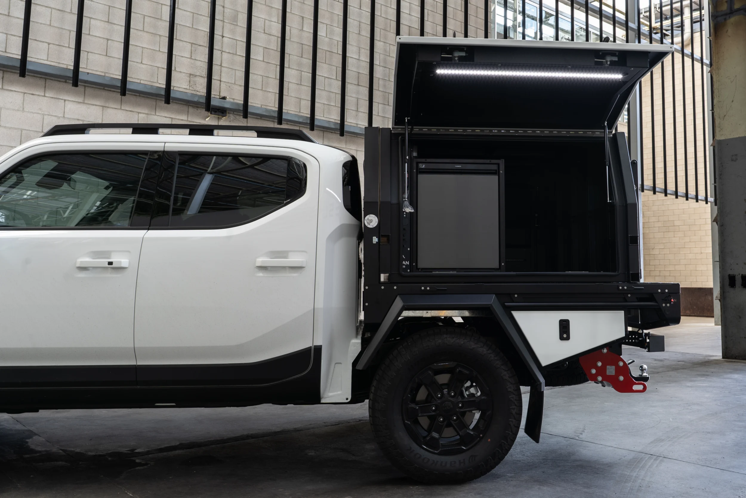 This 1400mm canopy includes a Dometic 80L upright fridge on the passenger side, powered by our Weekender 12V system, giving the owner cold storage and charging capability wherever they travel.